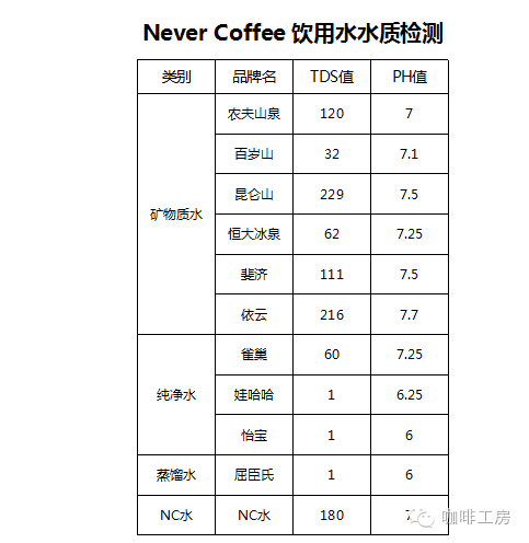 在日常生活中,我们经常见到水壶用久后内壁会有水垢生成,这是因为在我们取用的水中含有不少无机盐类物质,如钙、镁盐等。这些盐在常温下的水中肉眼无法发现,一旦它们加温煮沸,便有不少钙、镁盐以碳酸盐形式沉淀出来,它们紧贴壶壁就形成水垢。猫爷所在的厦门水质相对较软,因此水壶或咖啡机不容易出现水垢,但据北方的朋友叙述,哪怕是新的水壶接自来水烧几次,就有可能在水壶壁产生水垢。这应该就是很典型的南北水质差异。水中各种物质对咖啡口感的影响 我们通常把水中钙、镁离子的含量用“硬度”这个指标来表示。硬度1度相当于每升水中含有10毫克氧化钙。低于8度的水称为软水,高于17度的称为硬水,介于8~17度之间的称为中度硬水。雨、雪水都是软水,泉水、深井水、海水、江、河、湖水都是属于硬水。 一杯咖啡中有99%都是水,水对咖啡口感的影响可想而知,而我把水质对咖啡的影响分成主要三大类: 1,水的酸碱度(PH值) 2,水中可溶解物质(TDS) 3,水的软硬度(水中钙镁离子含量) 当然,也有些钙、镁离子含量很高的水却不见有水垢生成,这是因为这些钙、镁离子以氯化盐形式存在,它们是可溶的,所以在加热时并不能沉淀出来。由此可知,水壶内壁上没有水垢并不能说明水中不含有钙、镁化合物,也不代表其水质属于软水。