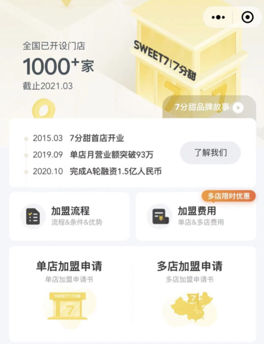 比如7分甜,我关注到,目前推出多店加盟限时二送一的优惠,即免除第三家店加盟费。