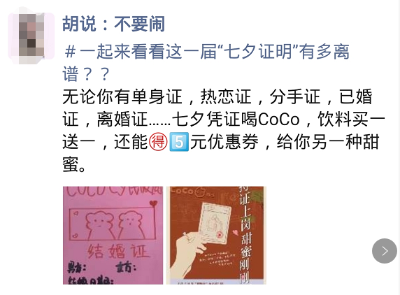 CoCo都可推出持结婚证享受指定饮品买赠活动,结果被粉丝传播成凭热恋证、单身证、分手证,离婚证都可参与,还有的晒出手绘版结婚证要求参与活动。