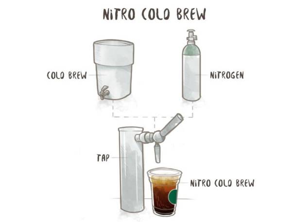 日本式冰咖啡并不是冰滴咖啡,但有些人说它的味道甚至比冰滴咖啡好,因为他们相信有些特殊的气味分子是需要加热才能萃取出来的。其做法是在手冲咖啡的滤杯下放装有冰块的盛杯,直接冷却手冲咖啡的萃取液。如果想要省时,也是一种选择。 低温所萃取出的咖啡味道,会依咖啡烘焙程度、水量、水温、水滴速度、咖啡研磨粗细等因素而改变,完美比例需靠时间、经验调整。低温萃取咖啡味道甘醇、酸度较低、苦味温和,发酵後也更添层次,但同时也比较容易失去高温下才得已释放的特殊风味,因此豆子品种与烘焙程度的挑选也需要特别斟酌。 若想试试自己在家做冷萃咖啡,「Cold brew」兄弟党 Jan 与 Niclas 教大家4项简易小撇步:一、建议就是约面包屑一样的粗细度,并依萃取时间长度来时时做调整;二、冰酿所需时间约12~24小时,18小时最好喝,如果是冰滴咖啡,则萃取时间较短,大约掌控在1秒滴落1滴咖啡的速度即可;三、不必用到0度C的冰水,大约低於20度C的过滤水即可;四、如果是冷酿咖啡,那就只剩最後一步了:把咖啡渣过滤掉。 氮气冷萃咖啡(NITRO COLD BREW)