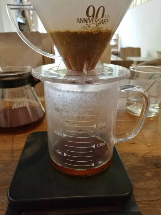 总用时间:1分55秒 热的时候饮用口感浑浊清茶香突出,同样也是等温度下降一点风味爆发 风味:坚果味 口感:触感高 ,浓郁 使用KONO滤杯主要是因为下水速度慢来增加咖啡浸泡时间,因为烘培较浅避免把清茶类或草本味放大,用比较低的温度粗水状缓慢注水避免出现杂乱味道,因为萃取物质比较少并缩短水分比例。 不管如何冲煮,均衡或者触感较强都是只是为了能够带来一杯更加符合每个客人喜欢的类型,更加贴近他们所想象的。