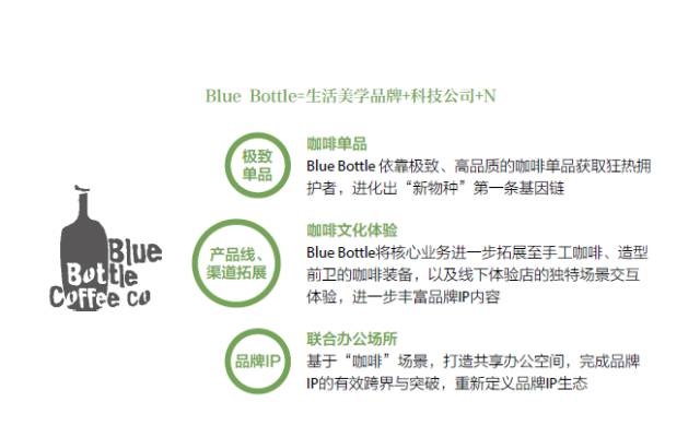 回顾Blue Bottle如何将咖啡文化做到极致:从最终小小一杯咖啡成品,向前溯源到品牌的诞生地旧金山湾区。也许是受出生地的原始基因影响,BlueBottle天生便带着硅谷的科技感气质,加上其深度植入的“众创空间”模式,深受美国科技从业者的青睐便也在情理之中。Blue Bottle的经营模式唤醒了许多被制式条规所限制的连接与沟通方式。精细优美的器具、烘焙者一丝不苟的匠人技艺,以及人文感与现代感结合的场景空间,这些是否让你想到了“科技与艺术的结合”?也许这就是Blue Bottle被称为咖啡界Apple的原因。Blue Bottle通过极致的产品、场景和体验,以及围绕着推出创新、硅谷、科技、匠人等标签内容,无不是突显其独特的品类,不断充盈其内涵,打造超级IP,牢牢地吸引了咖啡“怪咖”这一小部分人群,建立起自己的垄断之地,成功地实现了从0到1。