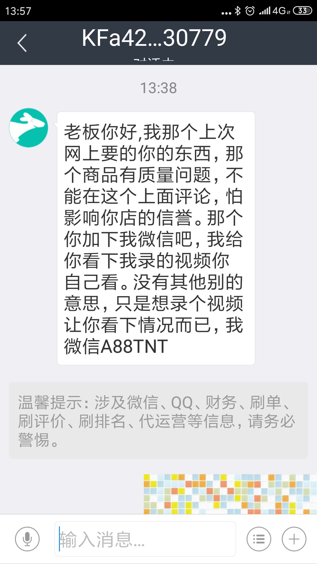 “没有其他别的意思,只是想录个视频让你看下情况而已,我微信是……”最近,快报多个老板交流群的奶茶店老板晒出一张图片,图片中文字几乎一样,大意是:买了你家的东西,质量有问题,怕影响店面声誉,加微信给商家看录制的视频。稍有不同的则是“顾客”的微信号。