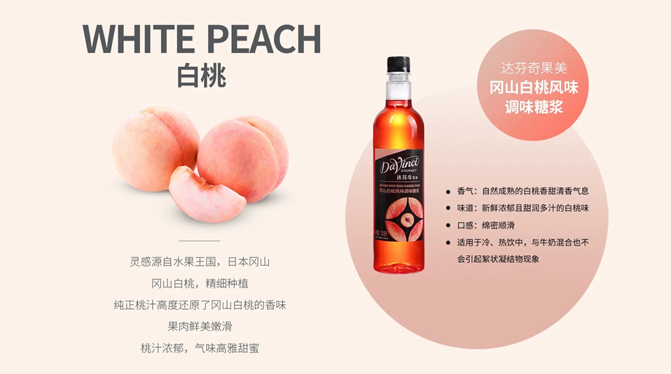 达芬奇果美冈山白桃风味调味糖浆灵感源自日本冈山白桃,添加了桃汁,高度还原了冈山白桃的香味,满满少女感小清新风味,为饮品注入蜜恋般的幸福感觉。