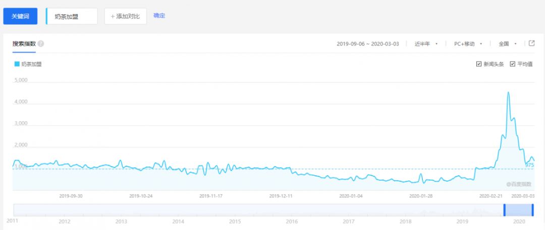 据第三方工具百度指数显示,2020年3月开始,咨询奶茶加盟项目的人数剧增。