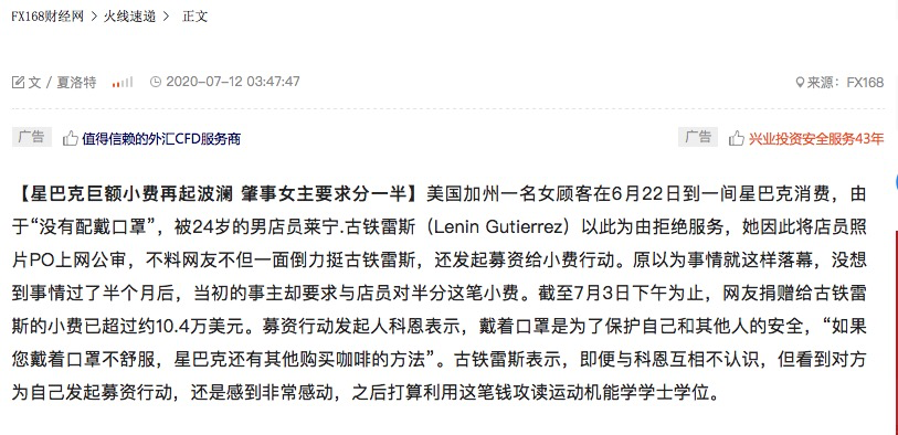 此前星巴克发言人也发布声明表示:"我们希望每位来店里的顾客都能受到款待,与此同时,希望大家遵守公共卫生安全,保持社交距离及安全规章,包括进入店内自觉戴口罩等。"不过,今日有媒体报道,事主要求与该星巴克店员对半分这笔小费。