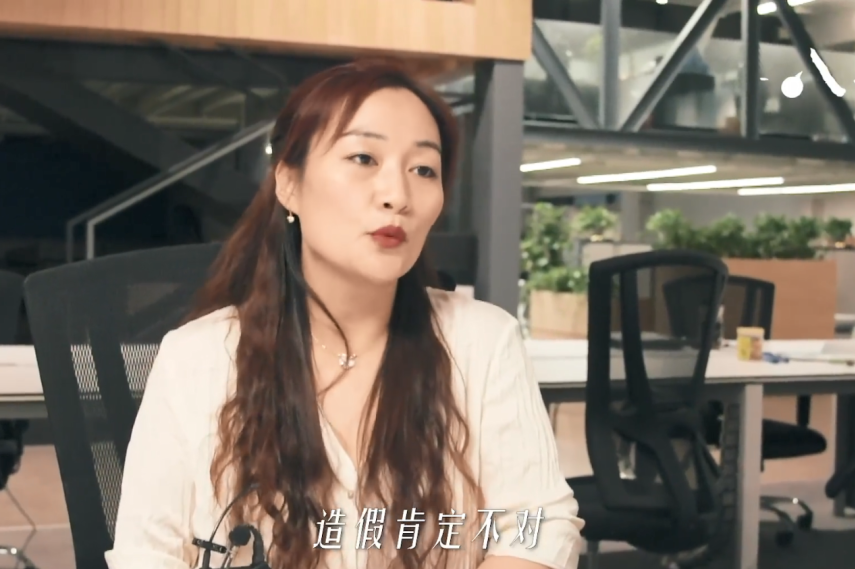 董事长兼CEO郭谨一的出场带着些许喜感,他拿着十元店同款按摩捶,一边敲打着背脊,一边走向董事长工位——格子间的头一个。