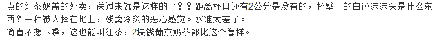 对于奶盖茶外卖的投诉,多集中于两点,一是其他饮品外卖饮品的“通病”——温度缺失,热饮变冷饮,或者冷饮变温饮。
