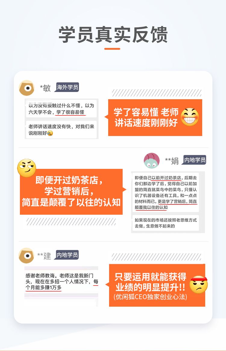 如果在学校考试不通过,可以通过不断的复习来提升成绩,与学校不一样的是,营销课程学完之后你只能直接通过实践来检验效果,往往很多学习到的内容只应用了15%~20%左右,但很多学员只用了这15~20%的内容都已经经营的很不错了。