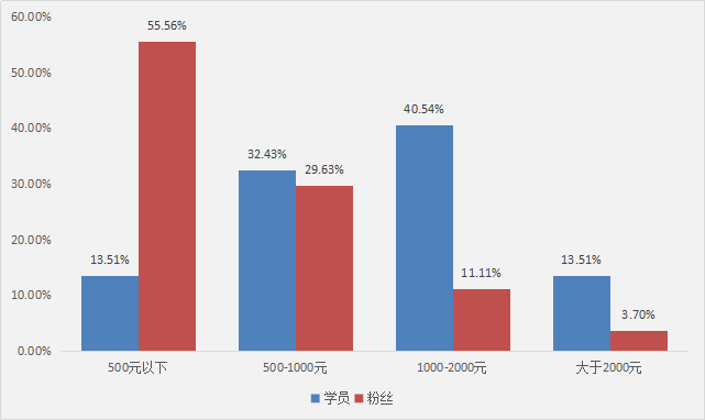 相较粉丝我们学员日营业额500元以下的占比只有13%,不到粉丝的1/4;日营业额在1000元以上学员占比超53%,而粉丝的占比不到15%。