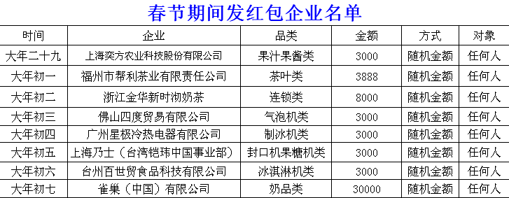 亲爱的饮品界的粉丝们,由饮品界发起,8家饮品企业参与的“读快报得红包”活动将在春节期间正式“上映”,从大年二十九(今年木有三十哦,即2016年2月7日)开始,一直持续到大年初七(2016年2月14日),每天晚上8点钟,打开饮品快报,获取企业的“支付宝口令”你就可以疯狂抢红包了。本次共有8家企业参与发放红包,总金额为56888元。发放红包企业如下: