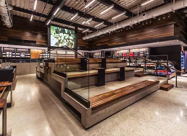 店铺内整体呈现暖色调混合工业元素,用到了胡桃木、黑色钢材、混凝土和玻璃。座位对面悬挂着 150 平方英尺的投影屏幕播放着一些艺术作品、图片和视频,讲述关于一杯星巴克的咖啡从种子到最终成为你杯中咖啡的故事。门店设计师 Erich Mele 说:「剧院的设计为这样独特的座位体验带来了灵感,顾客可以享受看台上两边分层的座位,不管是观看店内的投影还是窗外的风景都有良好的视野。」