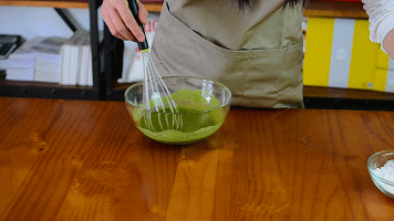 将三分之一蛋白糊加入到DK宇治抹茶蛋黄糊中用翻拌手法搅拌均匀,不可画圈搅拌,容易消泡。