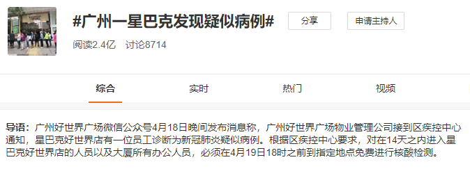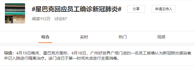 4月19日晚间,星巴克回应该员工于当地时间4月18日在新冠病毒检测中呈阳性反应,被确认为新型肺炎感染者,目前该员工已入院进行隔离治疗。