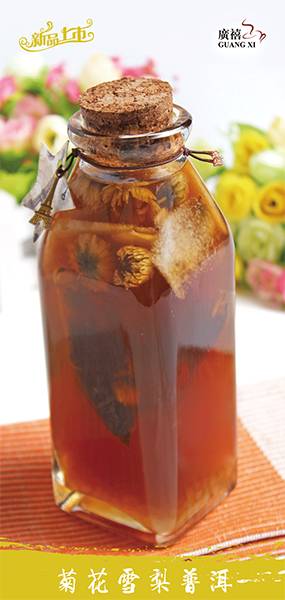 菊花雪梨普洱配方老树菊普茶包200ml热水泡2分钟,加入广村雪梨茶20g、新鲜雪梨50g、天禧果糖35g、热水100ml、饮用水100ml搅拌均匀即可出品。