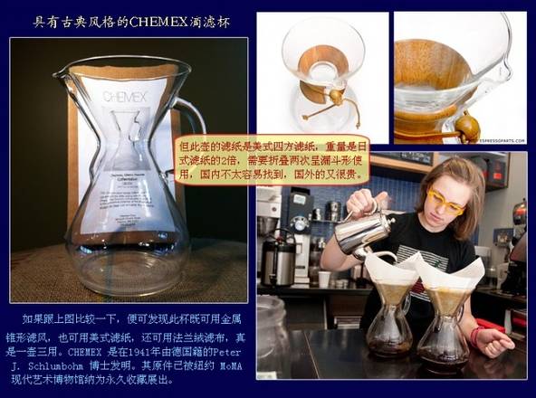 美式滤泡壶的滤纸并非漏斗状,而是平整的四角或是圆形滤纸。这是在实验室里常用的方法,将平整的滤纸折两次,折成漏斗形状。或许是因为发明者曾是化学博士的关系。Kono跟Hario的滤纸也是选用尾端尖尖的漏斗状,滤纸壁被水浸湿的话,就能承受变重的咖啡,并利用压力附着两面。然而美式滤泡壶的漏斗及烧瓶部分并没有承接的部分,由于放着滤纸,若是使用缝制的滤纸,则会因为咖啡的重量,使滤纸的两边破裂。就像直接在马克杯上放上滤纸,然后泡咖啡的方法一样简单。但篮子形状的滤纸,能像圆形滤纸一样折两次,折成漏斗型来代替使用。好事做到底!所以把美式滤纸的折叠方法图示也放上,图很详细,所以不用翻译也能看懂了吧,方便大家随时查阅使用。但必须提醒准备选择凯梅克斯滤杯的国内朋友注意:这个美式滤纸有些不太好找,似乎整个亚洲都没有卖的,大厨曾在国外订购了一批,但无奈海关不放关,他也不禁在博客中发出“滤杯好找,滤纸难求”的感叹。凯梅克斯——想说爱你不容易。