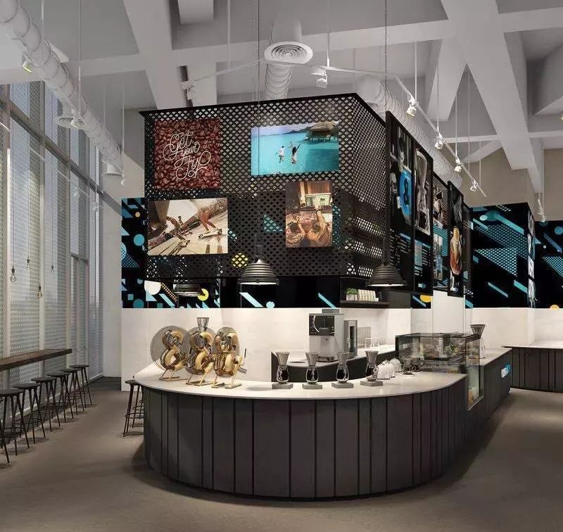整体的咖啡吧台为环形空间,一侧为意式咖啡、手冲出品吧台;另一侧为虹吸吧台