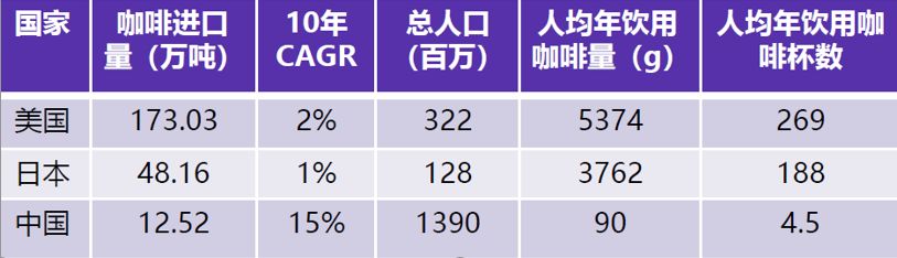 从数据上看,我国的咖啡增长量相对比较快,每年有15%的递增,相对美国和日本的消耗增速快很多。但是我国的人均咖啡杯数只有4.5杯,与美国人均269杯、日本人均188杯相比还有非常大的差距。说明我国咖啡消费很初级,习惯还在培养中,市场的增量空间很大,存量用户非常少。