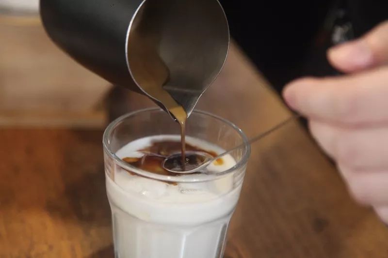 3、让咖啡沿着汤匙慢慢倒入杯中,倒入速度不可太快,以免破坏层次感。