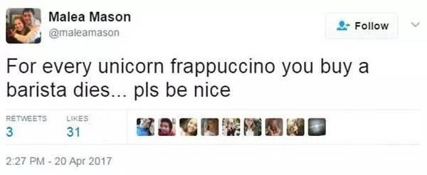 他们自己发起了抵制独角兽星冰乐的话题,画风十分清奇:“你每点一杯独角兽星冰乐就会有一个店员死掉……求你行行好吧”