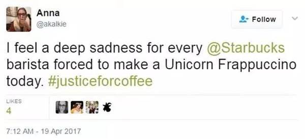 “心疼所有今天做了独角兽星冰乐的星巴克咖啡师……”
