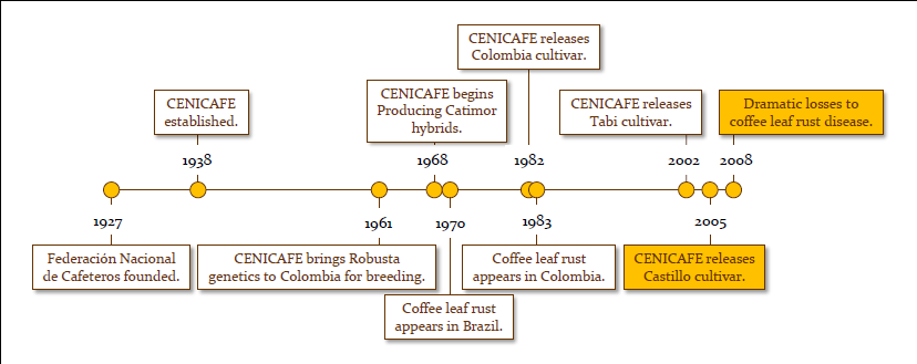 1961年开始,CENICAFE开始研究罗布斯塔血统的Timor品种,随后CENICAFE继续研发的脚步,2002年发布了第二款抗病品种Tabi(铁皮卡,波旁与Timor的杂交品种)