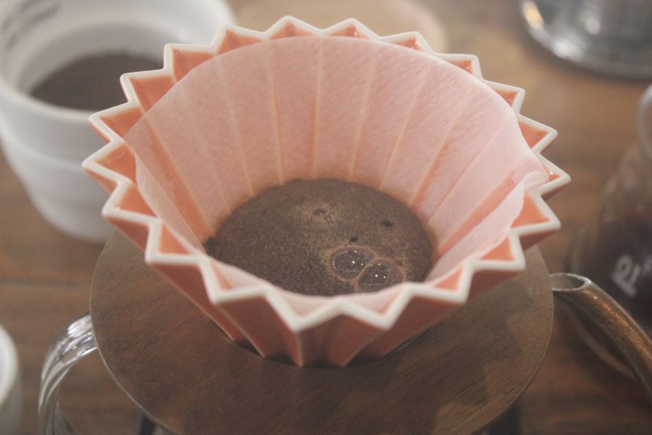 前街咖啡这次选择用锥形滤纸来进行冲煮,由于锥形滤纸是慢慢往下收小的,所以在中间的粉层比较厚四周的则会比较薄;而且锥形滤纸与滤杯的贴合度较差,在冲煮时咖啡粉的排气可以比较顺畅,在冲煮的时候如果水位高的话会很容易从滤纸滤杯中间的空隙流走。参数&手法:粉重15克;中细研磨(BG 6T:中国标准20号筛网通过率58%);水温90℃,粉水比1:15;