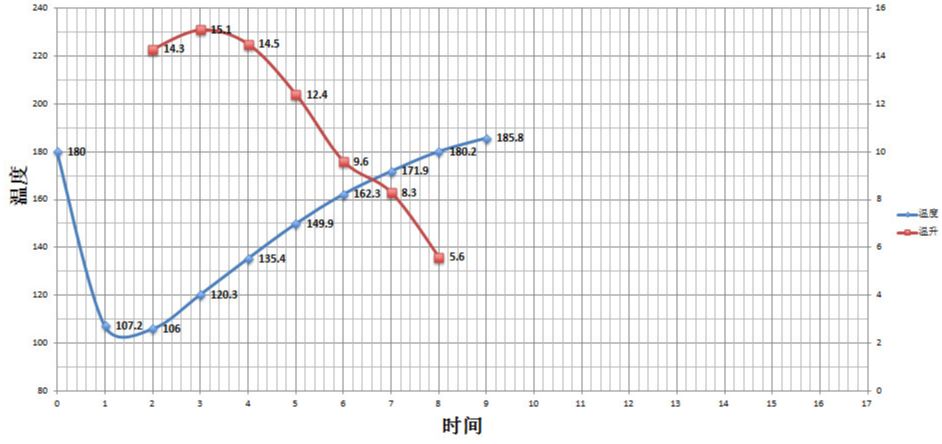 炉温至摄氏180度入锅,风门开设3,30秒后调火力至150,风门不变,回温点1'36",炉温140℃时调整火力至130,风门开至4;此时豆表变为黄色,青草味完全消失,进入脱水阶段,当炉温到达166℃时,将火力调至110度,风门不变;7'50"时,豆表出现丑陋胡皱褶和黑斑纹,烤面包味明显转为咖啡香,可以定义为一爆的前奏,这时候要听清楚一爆爆点的声音,到8'20"开始一爆,调小火力至50度,风门调至5(调火力要非常小心,不可小到无爆裂声),一爆后发展1'30",190度下锅。