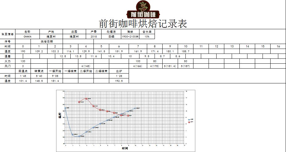 8'24"时,豆表出现丑陋胡皱褶和黑斑纹,烤面包味明显转为咖啡香,可以定义为一爆的前奏,这时候要听清楚一爆爆点的声音,到9'08"开始一爆,将风门调至5(调火力要非常小心,不可小到无爆裂声),一爆后发展1'28",192.5度下锅。