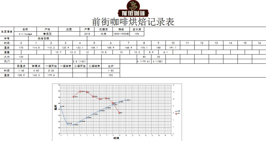 7’14”脱水完毕脱水完毕,火力和风门不变,7’30”是豆表出现皱着和黑斑纹,烤面包味转为咖啡香,为一爆前奏,这时要留意听一爆的声音。到8’20`”开始一爆,风门开4,火力降至50。一爆后发展时间1’50”,到188℃时火力降到30,拉平温升,至193.3℃下锅。