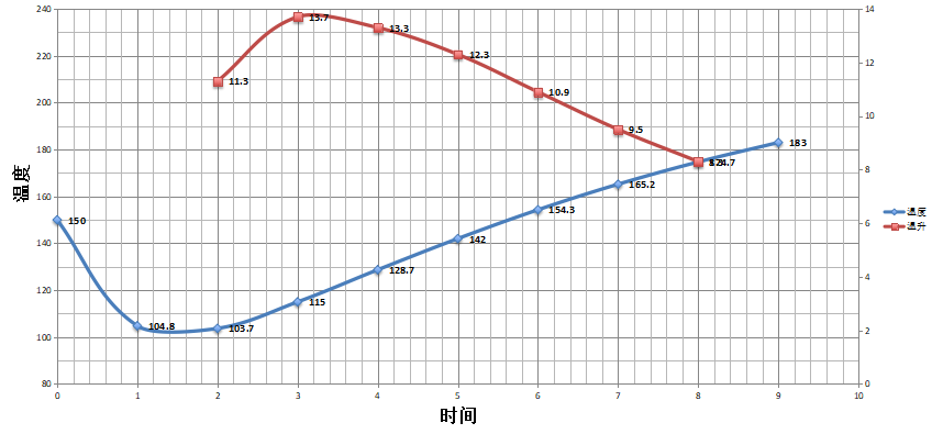 炉温150℃入锅,火力120,风门开设3;回温点1'36",炉温140℃时将风门开至4,火力不变;炉温146.2℃时豆表变为黄色,青草味完全消失,进入脱水阶段,当炉温到达160℃时,将火力调至70,风门不变;