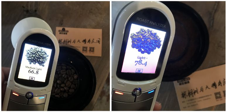 Agtron豆色值为66.8(左图),Agtron粉色值为78.4(右图),Roast Delta值为11.6。