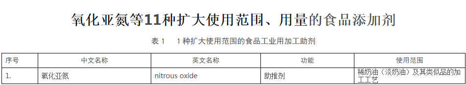 在《2015年计生委关于食品添加剂新品种的公告》中我们找到了氧化亚氮的名字,被定义为助推剂,用于稀奶油(淡奶油)及其类似品的加工工艺。