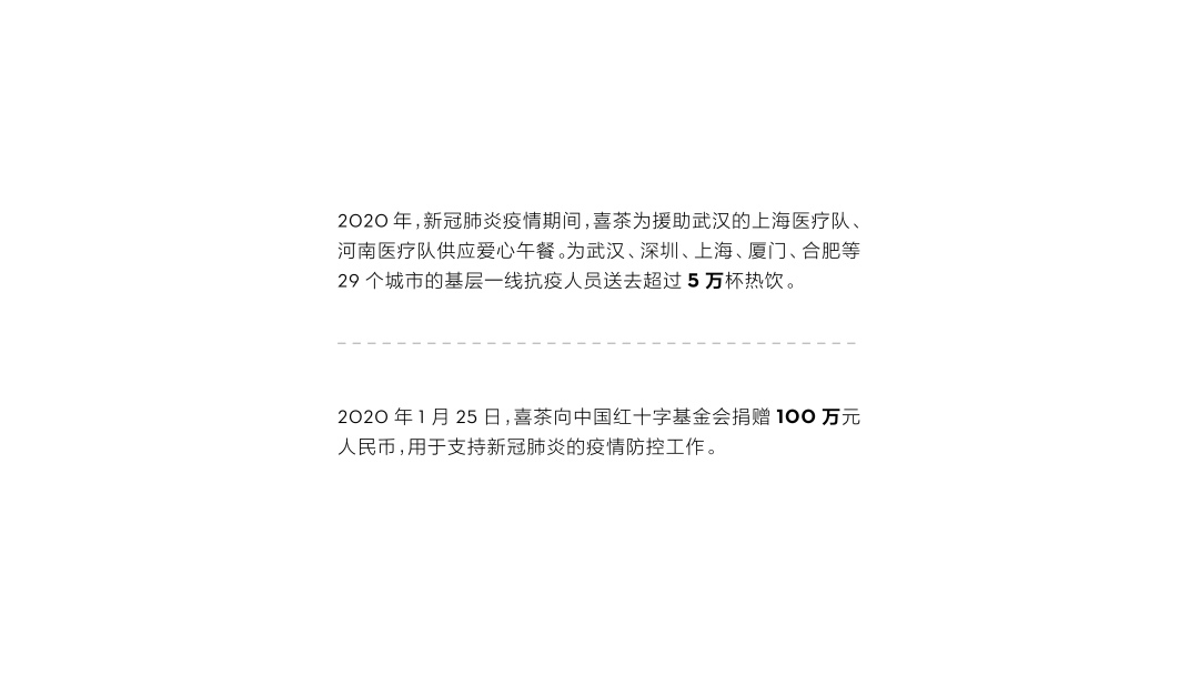 2020年,新冠肺炎疫情期间,喜茶为援助武汉的上海医疗队、河南医疗队供应爱心午餐,为武汉、深圳、上海、厦门、合肥等29座城市的基层一线抗疫人员送去超过5万杯热饮。