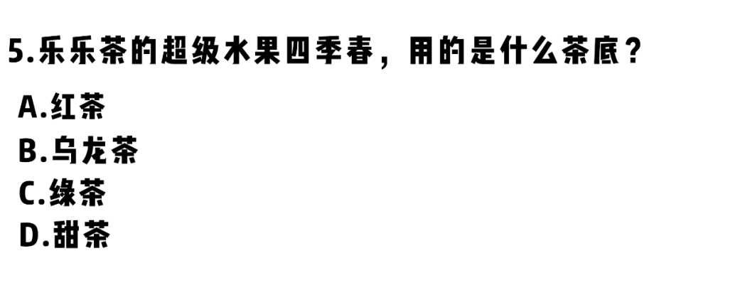 答案点击下方空白处获得答案正确答案:C解析:做错的同学快去饿了吗,美团上看看,一点点家的奶茶波霸、仙草、红豆、椰果都是免费加的,布丁、燕麦、奶霜才是需要加钱的哦!