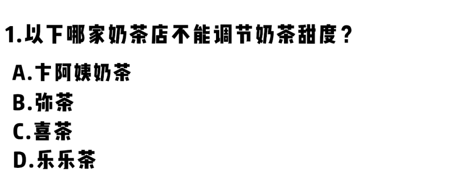 答案点击下方空白处获得答案正确答案:A解析:喝过的同学应该都知道,除了卞阿姨奶茶,其他几家奶茶都是可以调节甜度的哦!