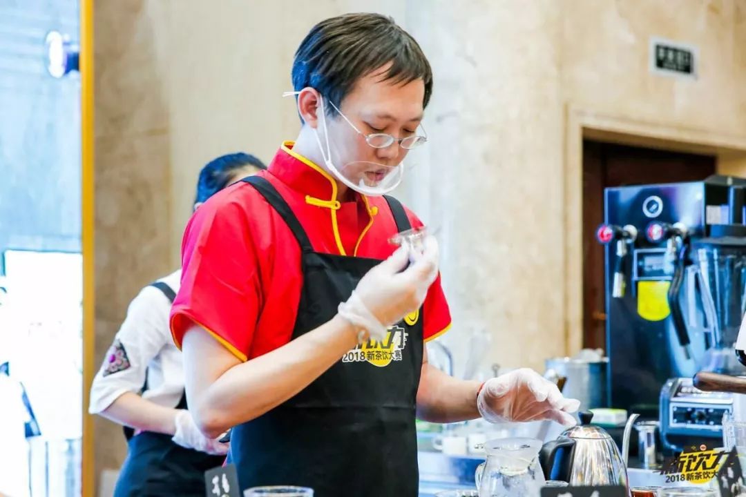 《芥问》同样大胆使用了芥末,底部加入柠檬,增加底蕴香气。总体来讲,华总赛区选手整体实力偏稳,但在激烈竞争下,也迸发出不少创意。例如,既使用到冬枣、苦瓜等冷门食材,选手陈楠还在奶茶中融入了山竹——这几天很有话题点的食材。另外,茶和咖啡的创意结合也被选手陈楠、陈雅运用,进行口感上的融合,也增加创意。更有看头的是,选手们在颜值和表演上也下足了功夫:自带BGM:两天的比赛中,有好几位选手都专门准备了音乐进行伴奏。并且,他们在音乐的选择上也各有特色:有活力的动感旋律,有带着这场比赛城市感情的《关于郑州的回忆》,还有浓浓古风味道的中国风歌曲,为饮品制作增添了别样韵味。做产品不如来段表演:选手陈伟雄在半决赛中的一个动作惊艳全场(如下图),很有气势地展现了拉茶大师傅的风采,也彰显了自己的实力。第二天也有选手尝试,可惜没有被拍下来(捂脸)。