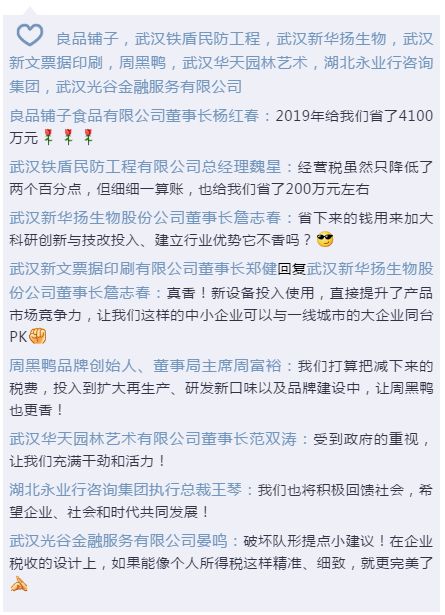 这个消息经该市党媒曝光后,一众老板在后面留言打call,其中包括周黑鸭品牌创始人、董事局主席周富裕,良品铺子食品有限公司董事长杨红春。