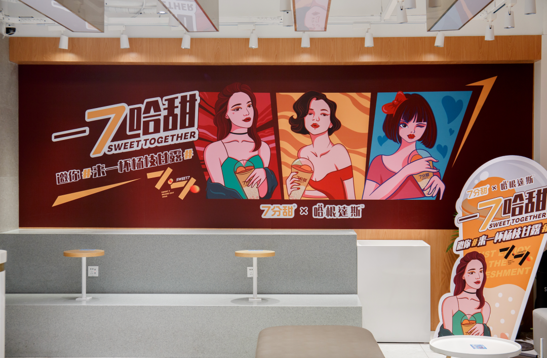 限量新品VS联名新款:产品怎么搞?任何品牌概念,最终要靠产品呈现,才能被消费者感知。不管做什么活动,在品牌日前后推一款有记忆点的产品,必不可少。品牌日限定新品,是常规操作,推出专属产品,辅以稀缺概念,撩拨顾客。也可以借助联名产品,实现势能翻倍,但联名的姿势很重要。7分甜今年的品牌日,选择其畅销14年的爆品杨枝甘露,和哈根达斯来了一次联名,研发了一款冰淇淋杨枝甘露,在品牌日的推广过程中,不断强化“杨枝甘露就喝7分甜”的标签。同时线下在门店和哈根达斯做了快闪活动,增加消费者的参与感,用哈根达斯的品牌质感为杨枝甘露做加持。