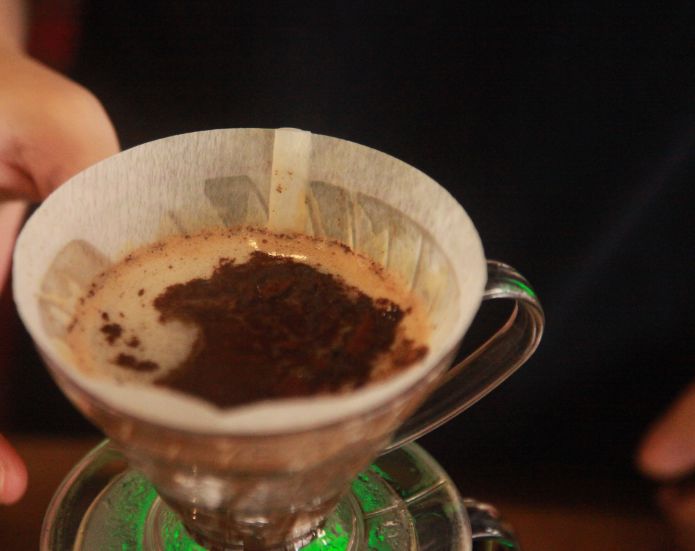 手法:将筛完细粉后的咖啡粉倒入滤杯内拍平,28克水闷蒸30秒,在25秒左右的时候倒入细粉,注水至123克分段,注水至225克结束冲煮,(闷蒸开始计时)萃取时间两分钟。
