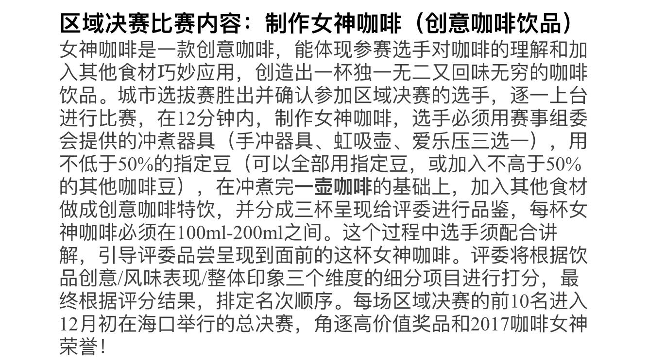 接下来我们看看“2017咖啡女神冲煮大赛”各赛程的规则,今年的比赛分为三个阶段,第一个阶段进行的是城市选拔赛,目前已经确定有超过30个城市将举办,城市选拔赛只比指定冲煮;第二个阶段进行的是区域决赛,共4场,比赛内容为制作女神咖啡(创意咖啡饮品),难度适中;第三个阶段进行的是总决赛,将在12月1-3日在海口进行,届时将比指定冲煮+女神咖啡,难度也是最大,今天先详细解读一下城市选拔赛的比赛内容:制定冲煮,和区域决赛的比赛内容:女神咖啡,以便所有准备参赛的选手,做好充分准备!