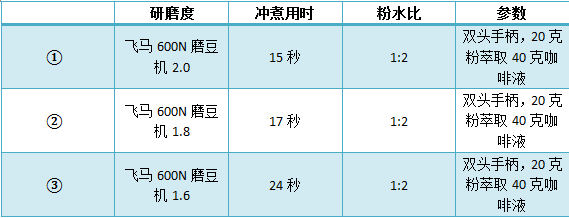 第一次:小编用了平时使用拼配豆的研磨度,飞马600N磨豆机2.0,粉水比1:2,双头20克粉萃取40克咖啡液,时间15秒。入口尖酸,发酵果香、茉莉花香浓郁。萃取时间太快且有尖酸,小编认为这是因为研磨粗了所以导致的萃取不足。