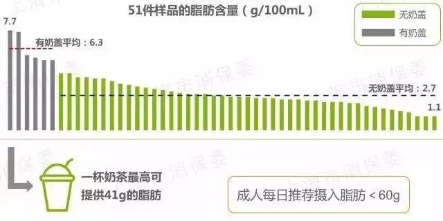 此外,调查显示,近六成消费者经常会选择有奶盖的奶茶,但部分人不知奶盖的脂肪其实很高。此次试验,脂肪含量最多的一杯奶盖奶茶可提供41克脂肪,而成人每日推荐摄入的脂肪小于60克。