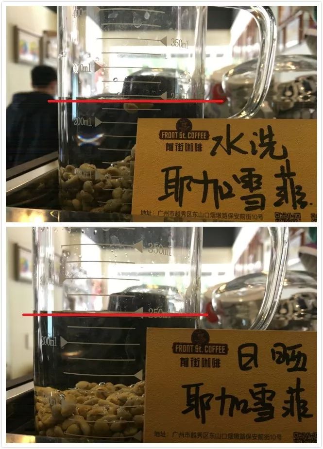 我们用最简单的方法,各称取50克的水洗和日晒咖啡豆,分别投进装有200毫升的水里,看看增加的容积,就能知道,水洗耶加所增加的容积更少,也就是平均密度更大——水洗法会把质量低的豆子冲走,并且清水浸泡过的咖啡豆细胞组织更高密度(浓度梯度问题,咖啡细胞液会部分流失)。