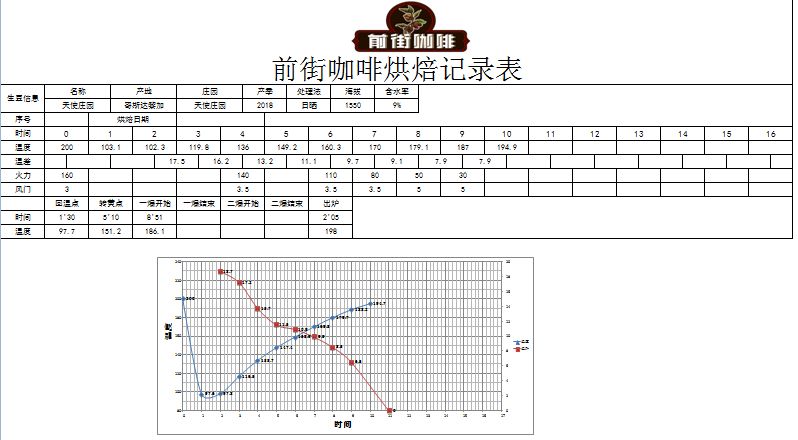 这支咖啡属于SHB等级极硬豆,豆质密度较大,含水率中等,转黄点在5分10秒左右,然后降低火力开风门进入梅纳反应,一爆时开大风门,保持火力,温度约186.1℃,一爆后2分05秒下豆。
