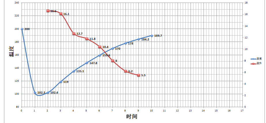 炉温至摄氏200度入锅,风门开设3,1分钟后调火力160度,风门不变,154度调一次火力,降到130度,风门开到4,烘至5‘30”,豆表变为黄色,青草味完全消失,脱水完成,火力调至100度,风门不变4;7'50"时豆表出现丑陋胡皱褶和黑斑纹,烤面包味明显转为咖啡香,可以定义为一爆的前奏,这时候要听清楚一爆爆点的声音,到8’40”开始一爆,调小火力至50度,风门全开(调火力要非常小心,不可小到无爆裂声),在190.4度下锅。
