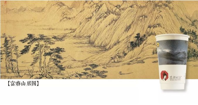 ▲氛围场景构建同样玩花的,还有上海的米其林一星餐厅茉颂(MONCEAU),店里的一面花墙让无数少女心不在的老阿姨拍了又拍。从粉色店开始,装修场景上玩体验感已经成为行业常态,而能玩出创意和突破,你就赢了。2.拼物料:把千里江山图捧在手心相比于兴师动众的装修,在物料上做些小手脚,一样能让顾客有惊喜。满满中国风特色的茶颜悦色,曾高价买了郎世宁画作的版权,用作门店视觉呈现。最近居然把《富春山居图》、《千里江山图》等四幅名画直接用在杯子上,对顾客来说,把名画捧在手心的感觉多么超凡脱俗啊。
