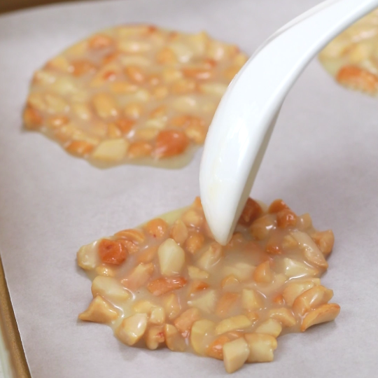 ⑤烤盘上垫油纸,取半勺面糊,尽量摊薄一些,厚度不超过一粒花生碎的高度。配方可以做18片,一盘可以烤9片,没有风炉的话,就分两次烤。