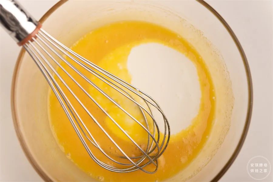 ②蛋糊中倒入白砂糖、淡奶油以及牛奶,搅拌均匀。