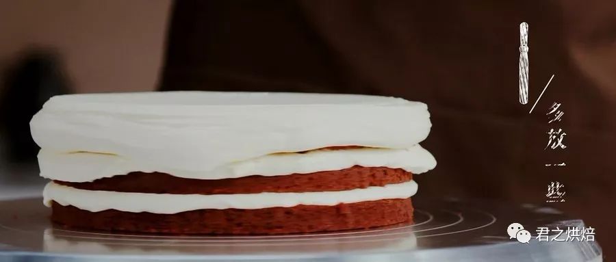 15、盖上第二片蛋糕片,同样放上奶酪霜并用抹平。